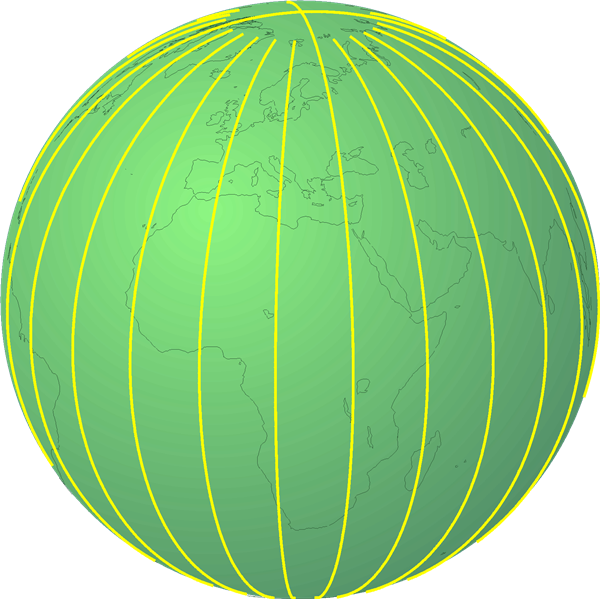 Points with the same latitude form a parallel — think about spinning the earth around while that red knitting needle is held firmly in place at an angle of φ. Points with the same longitude form a meridian — that's what you get when you drop the knitting needle to the equator, down to the south pole and all the way around.