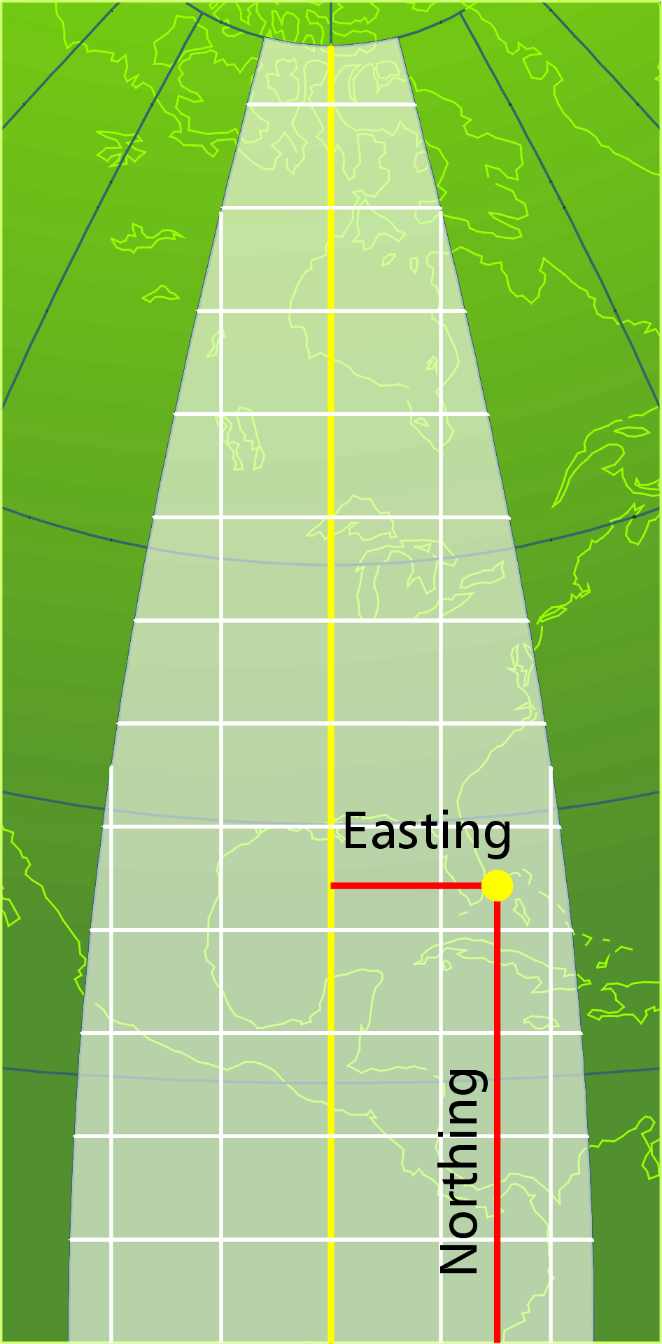 UTM is set up as 60 projection zones, each like the strip illustrated above, beginning at 180°W, and stepping eastward in 6° intervals. The first strip is Zone 1, extending from 180°W to 174°W with a CM at 177°W. Zone 2 is 174°W to 168°W with a CM at 171°W, etc. This takes care of multiple instances of 396,000 m E. But there's still potential for ambiguity because places in the northern and southern hemisphere can have the same northings. So the hemisphere should become part of the location spec: to place any point on the earth unambiguously, we'd need: {zone, hemisphere, easting, northing}, e.g. 11 N 326809, 4318679 where N is the northern hemisphere. This notation is used by some researchers but it is not the official UTM syntax.